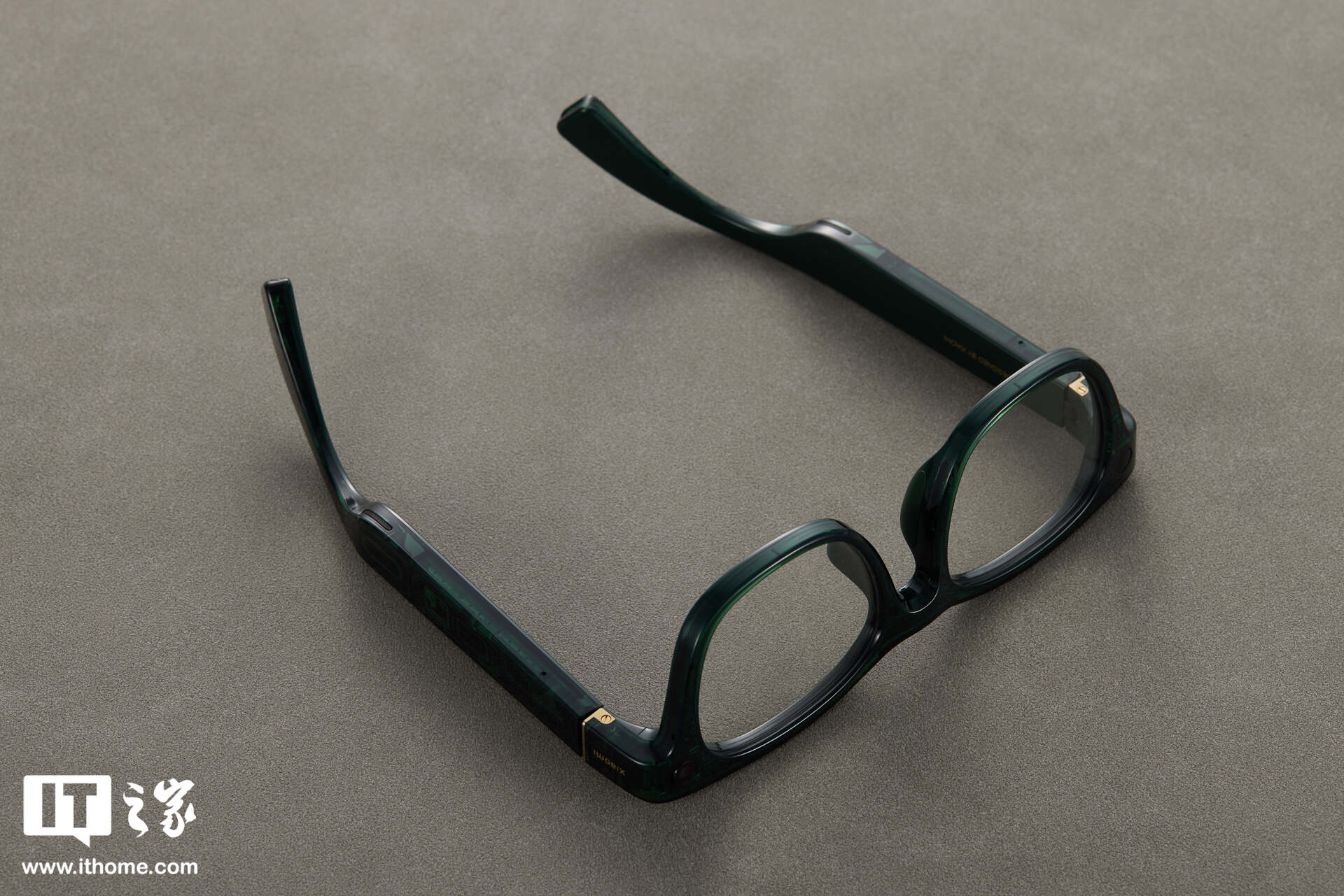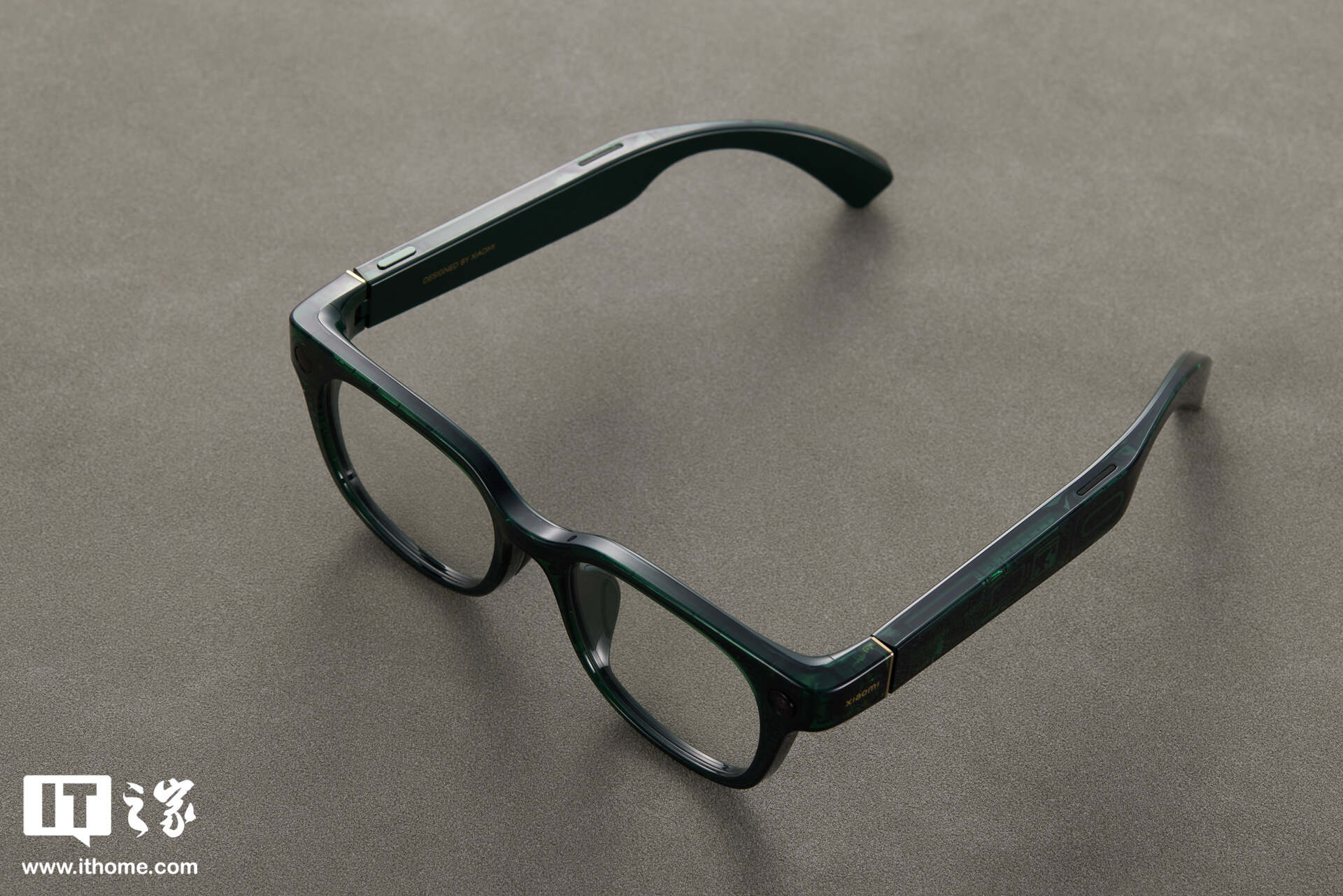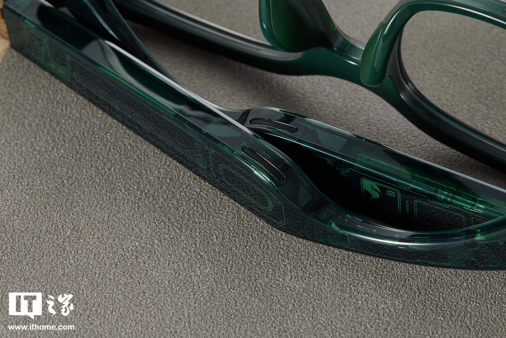 这次小米 AI 眼镜在设计上也动了一点小心思 —— 玳瑁棕、鹦鹉绿两款配色均采用了半透明设计。IT之家这次实拍的为鹦鹉绿配色,尽管采用了半透明设计,但是只有当你非常靠近眼镜的时候,才能看到透明内部的电路纹理。稍远一点,或许会当成是眼镜本身的装饰图案。
