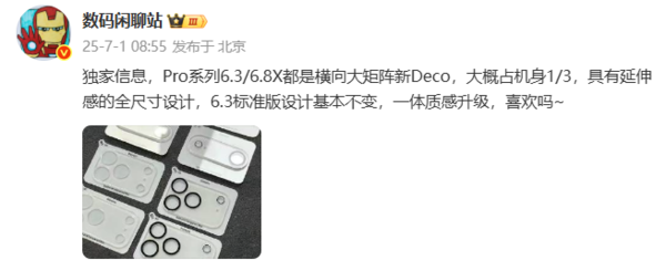 据悉,小米16 Pro系列将采用横向大矩阵新Deco设计。这种设计使模组大概占据机身1/3的面积,并采用延伸感十足的全尺寸设计。而标准版设计基本保持不变,但手机一体性、质感均会升级。手机尺寸方面,小米16标准版和Pro版均为6.3英寸,而16 Pro Max为6.8英寸。此外,该博主还透露16系列标准版将不会采用潜望长焦镜头,而Pro系列将会搭载。