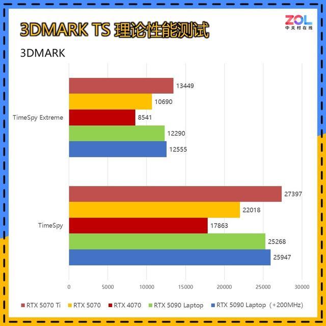 其次是代表DX12性能的Time Spy测试套装。从成绩来看,移动版RTX 5090依旧没有追上桌面版RTX 5070 Ti,即使超频200MHz也是如此,性能差距在8%左右;超频200MHz后差距在6%左右。