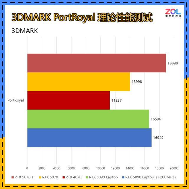 再次是代表光追性能的Port Royal测试,可以看到移动版RTX 5090与桌面版RTX 5070 Ti有着较为明显的差距,超过了10%。