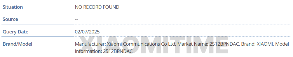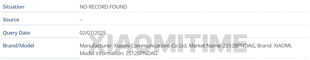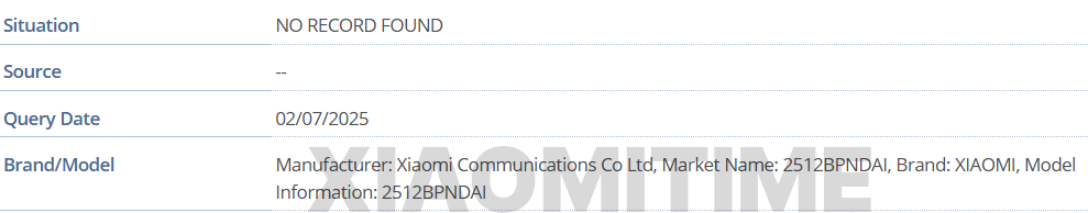 消息源发现了 2512BPNDAC、2512BPNDAI 和 2512BPNDG 三款型号,分别对应中国版、印度版和国际版,该媒体预估为小米 16 Ultra 机型。IT之家附上相关图片如下: