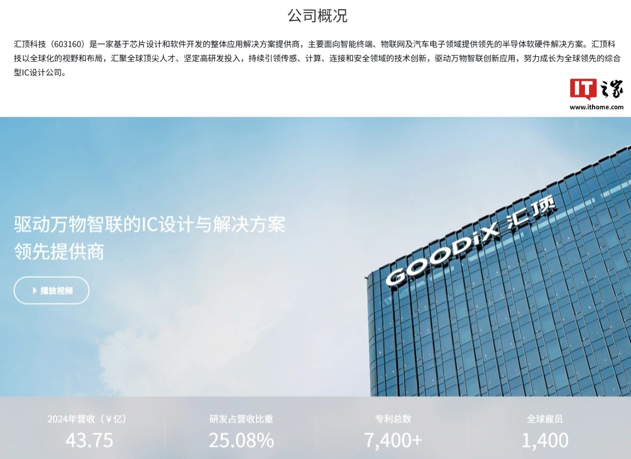 IT之家查询获悉,汇顶科技是一家基于芯片设计和软件开发的整体应用解决方案提供商,主要面向智能终端、物联网及汽车电子领域提供领先的半导体软硬件解决方案。该公司 2024 年营收 43.75 亿元、研发占营收比重 25.08%、专利总数 7400+、全球雇员 1400。另外,其超声波指纹传感器在 vivo、小米、iQOO、REDMI、一加等国内手机品牌客户实现大规模商用,全年出货量超 800 万颗。