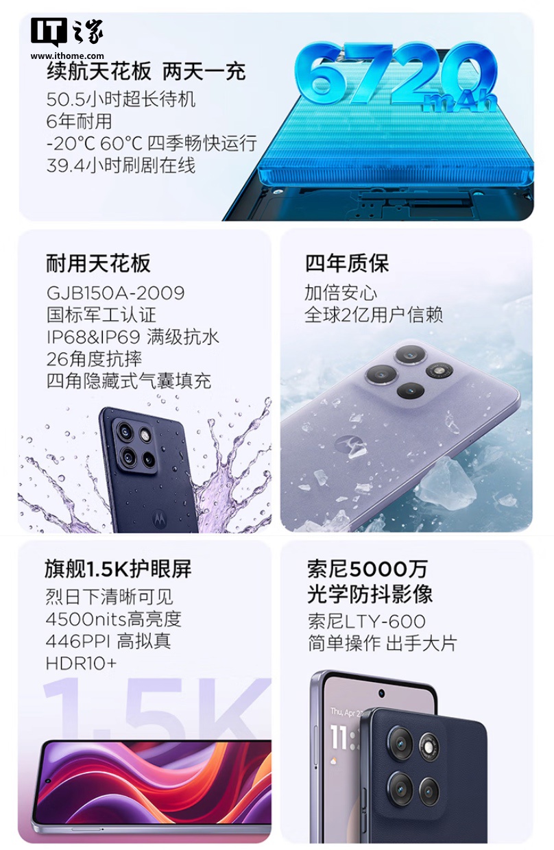 该机可选松烟蓝 / 绫罗紫 / 苔原青 / 云墨黑四种配色,正面搭载一块 6.7 英寸 1.5K 分辨率 120Hz 打孔面板(IT之家注:局部峰值亮度 4500 尼特),匹配 32MP 自拍摄像头,手机背面采用 moto 空气纳米皮,提供 50MP 主摄 + 8MP 超广角微距镜头 + 辅助镜头。