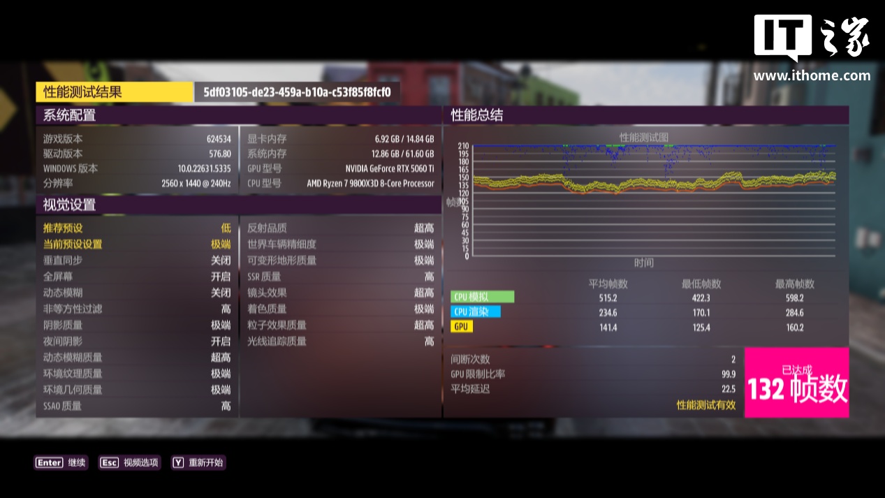 RTX 5060 Ti 在 2K 分辨率 + 极端画质下,游戏平均帧数 132 帧,1% Low 帧 112 帧;