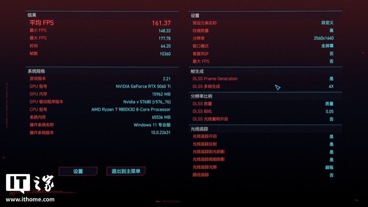《赛博朋克:2077》对显卡的压力有多大不用多说。在 1080P 和 2K 超级光追画质下,不开启 DLSS 和帧生成选项,游戏平均帧数分别只有 54 帧和 33 帧,无法达到流畅的游戏体验。
