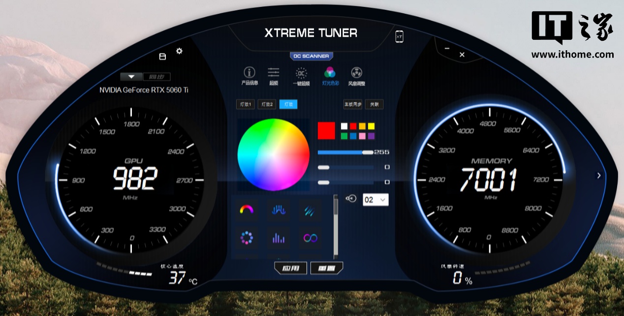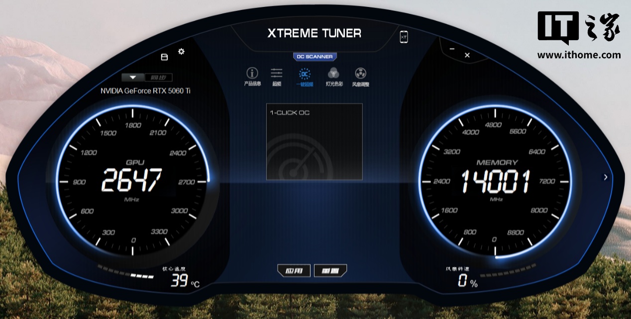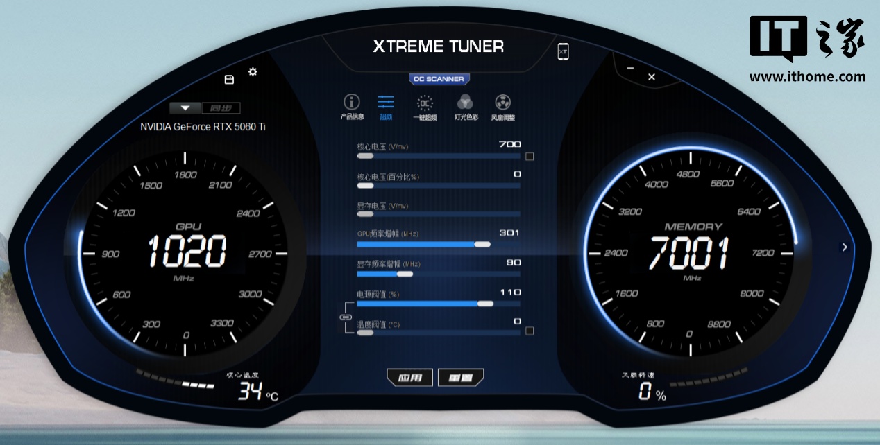 它的界面采用经典仪表盘风格设计,蓝黑配色,用过其它超频工具的小伙伴应该对这套交互不陌生。仪表盘左右两侧的刻度表分别显示当前 GPU 的实时核心频率和显存频率,下方还有核心温度和显卡风扇转速信息。