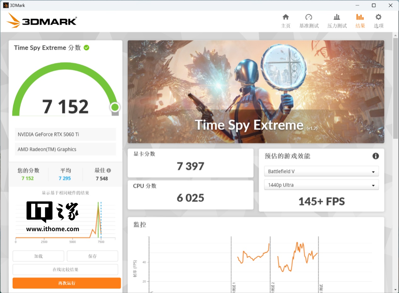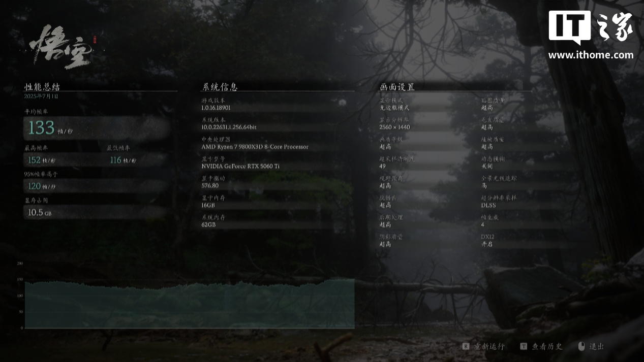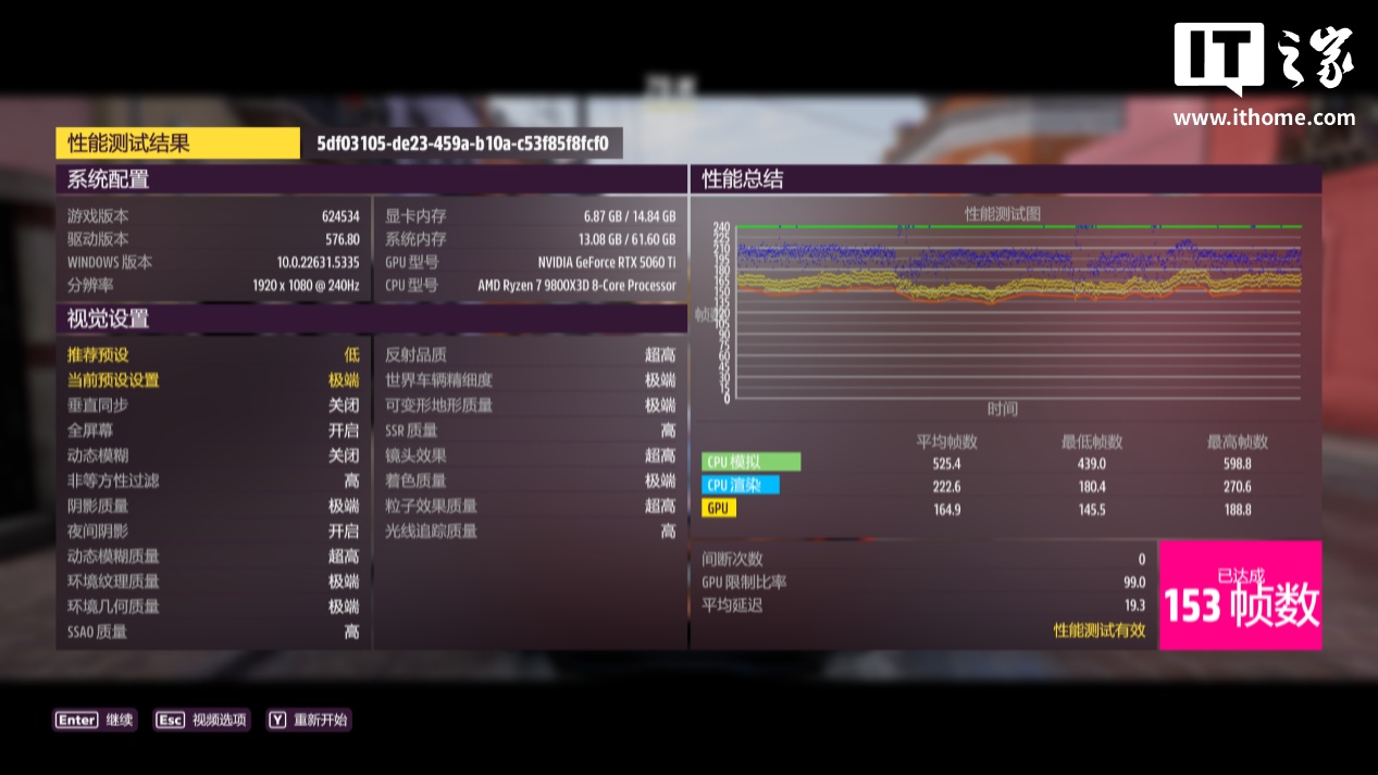 RTX 5060 Ti 在 1080P 分辨率 + 极端画质下,游戏平均帧数 153 帧,1% Low 帧 130 帧;