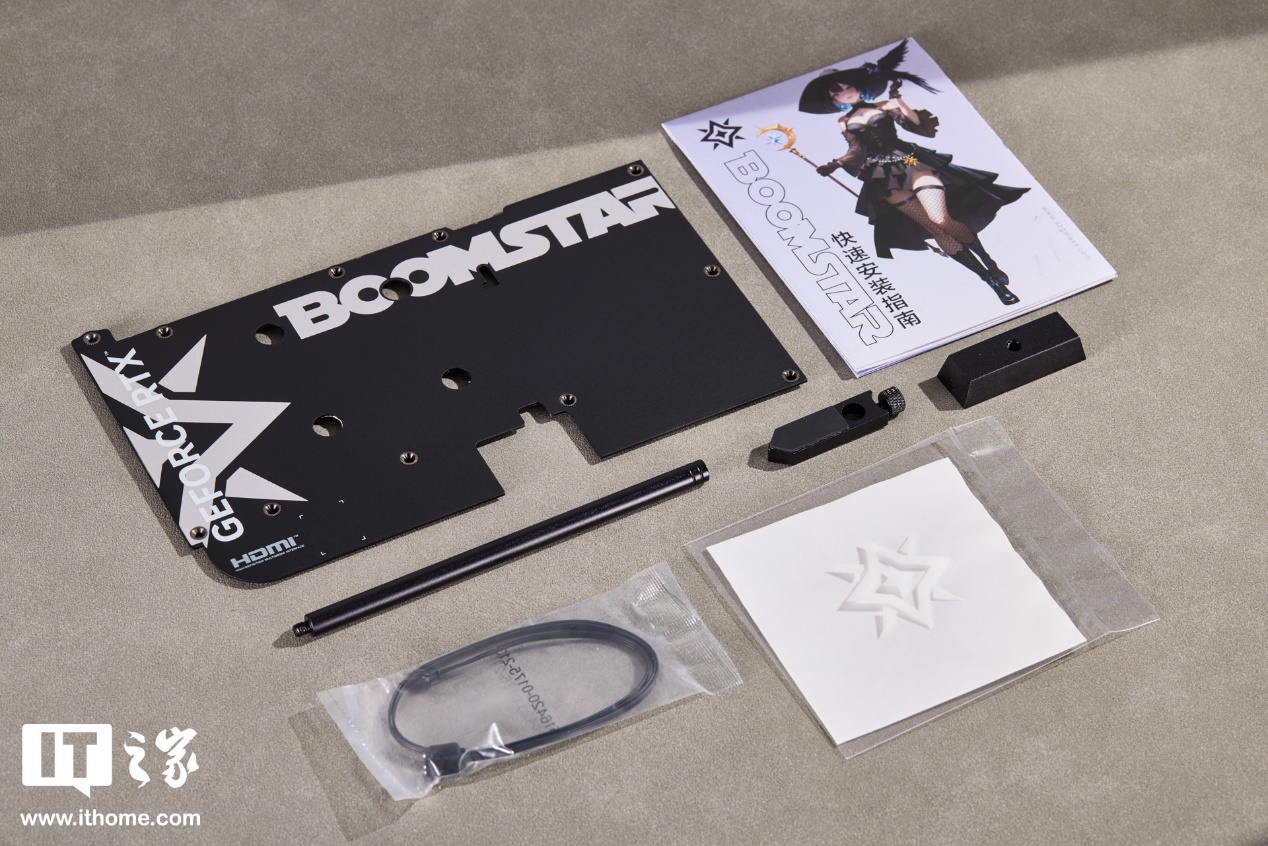 配件方面,除了前面提到的配件外,包装内还配有 1 套可拆卸设计的黑色金属显卡支架,镜面背板擦拭布以及一本快速安装说明手册。