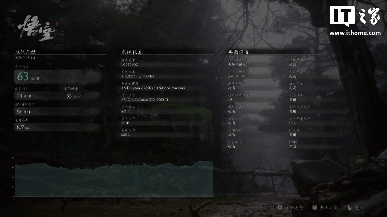 RTX 5060 Ti 在 2K 分辨率 + 最高画质下,游戏平均帧数 87 帧,1% Low 帧 72 帧;