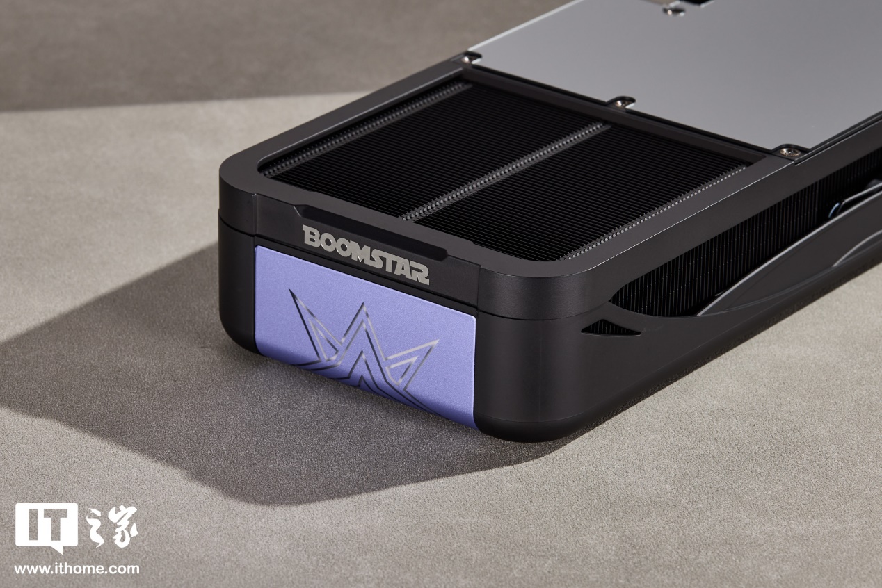 影驰 GeForce RTX 5060 Ti 星曜 NOX OC 显卡的一侧同样设计了不规则形状的镜面 RGB 灯板,居中位置印有 BOOMSTAR 专属星曜字母 Logo。