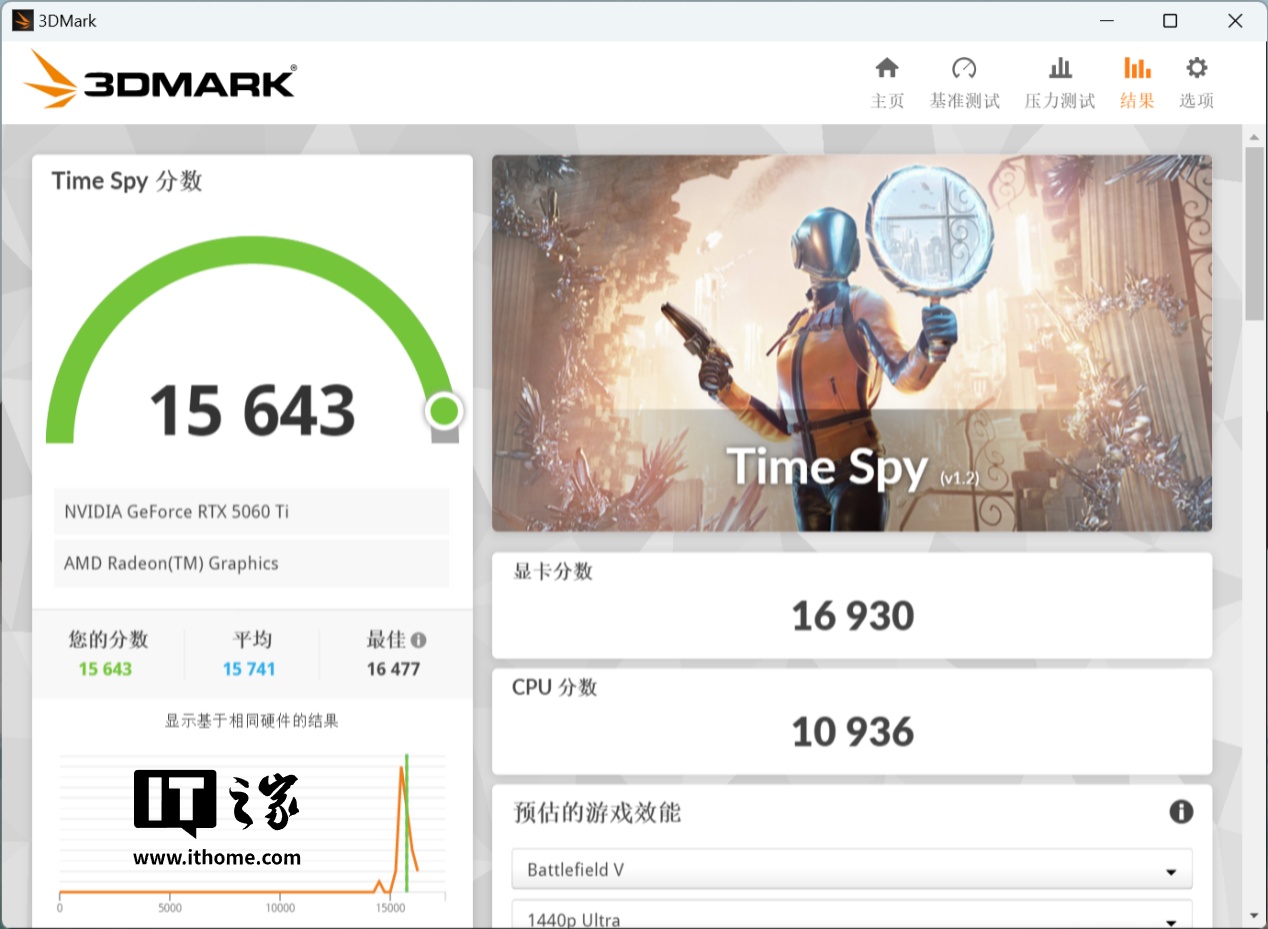 然后咱们复测一下 3D Mark 跑分看看效果,在 Time Spy 测试中,显卡分数由之前的 15995 分变成了 16930 分,提升了近 1000 分的成绩。