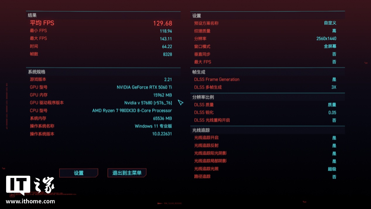 在不开启 DLSS 和帧生成选项时,2K 最高画质的游戏平均帧数为 133 帧,延迟为 15ms。