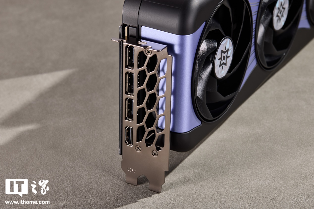 I/O 接口挡板部分厚度小于卡身,提供 3 个 DP2.1b 接口以及 1 个 HDMI2.1b 接口,最高支持 8K / 120Hz 视频输出和 4 屏同显。