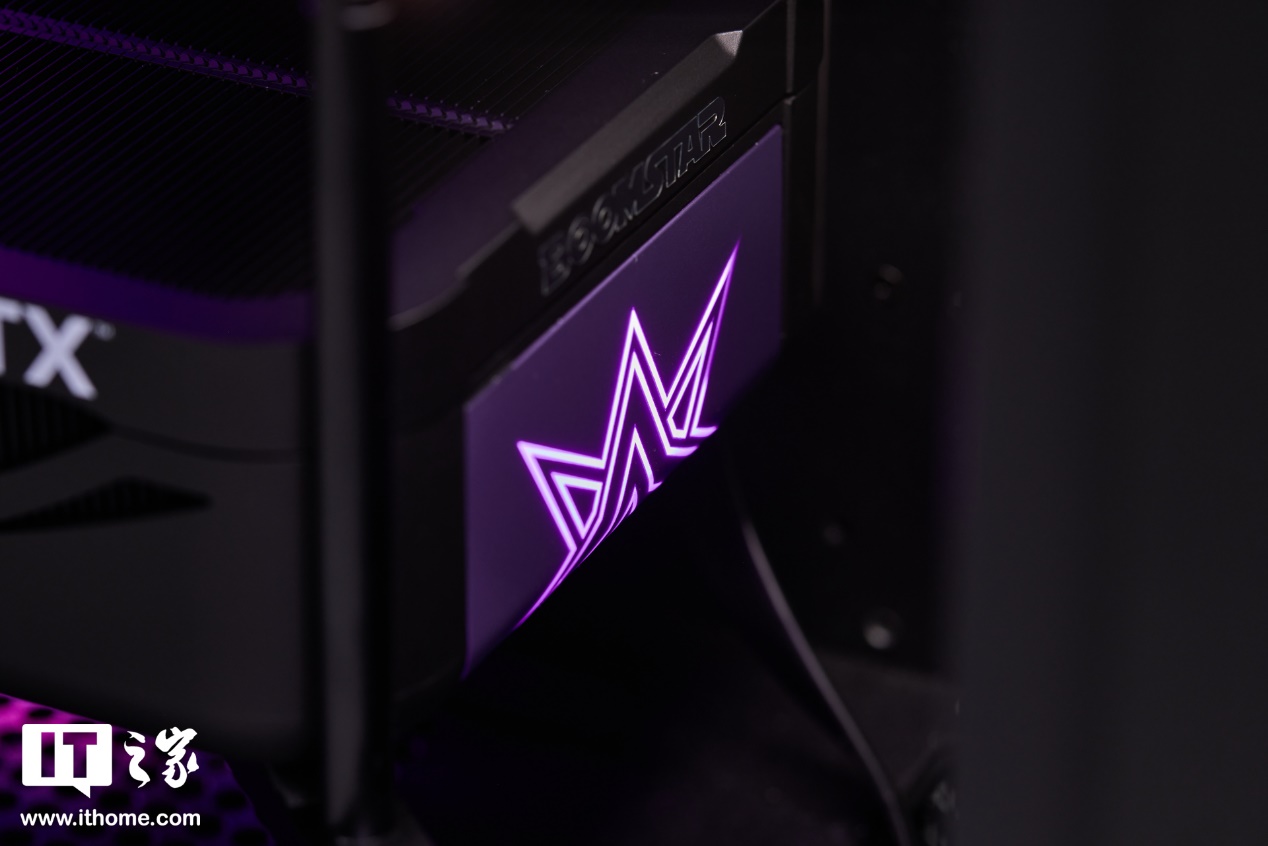 亮机后,整个镜面灯板会呈现无限镜的重叠效果,BOOMSTAR 标志两旁各有 3 颗星星点缀,配合紫色系灯光恰到好处。