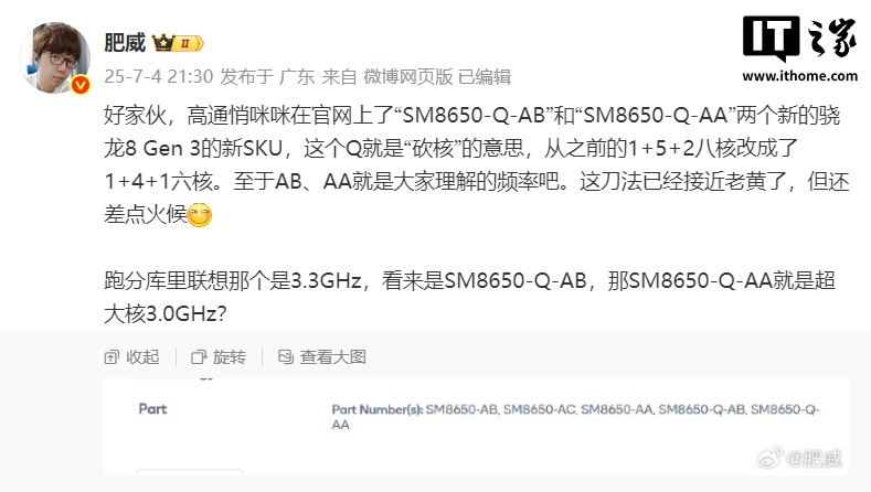 对此,博主 @肥威 表示,新 SKU 的 Q 就是“砍核”的意思,从之前的 1+5+2 八核改成了 1+4+1 六核。