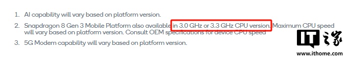 骁龙 8 Gen 3 领先版最高频率可达 3.4GHz,而标准版最高为 3.3GHz。高通官网显示,骁龙 8 Gen 3 还有 3.0GHz 版本,预计就是新增的两个版本。