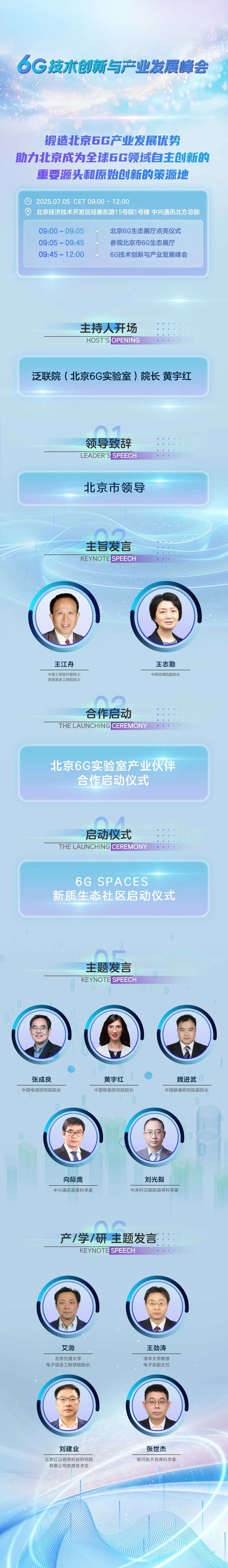 09:45-12:00 举行 6G 技术创新与产业发展峰会,包括主持人开场、领导致辞、主旨发言、合作启动仪式以及多个主题发言。