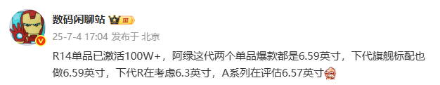 IT之家 7 月 4 日消息,博主 @数码闲聊站 今日爆料称,OPPO Reno 14 手机单品激活已超百万,OPPO 这代两个单品爆款都是 6.59 英寸,下代旗舰标配也做 6.59 英寸,下代 R 在考虑 6.3 英寸,A 系列在评估 6.57 英寸。