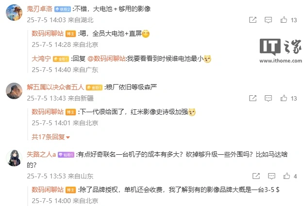 对于联名手机的成本,该博主透露除了品牌授权,单机还会收费,其了解到有的影像品牌大概是一台 3-5$。随后,他又在评论区爆料新机全员搭载大电池 + 直屏,下一代小米 REDMI 影像史诗级加强。