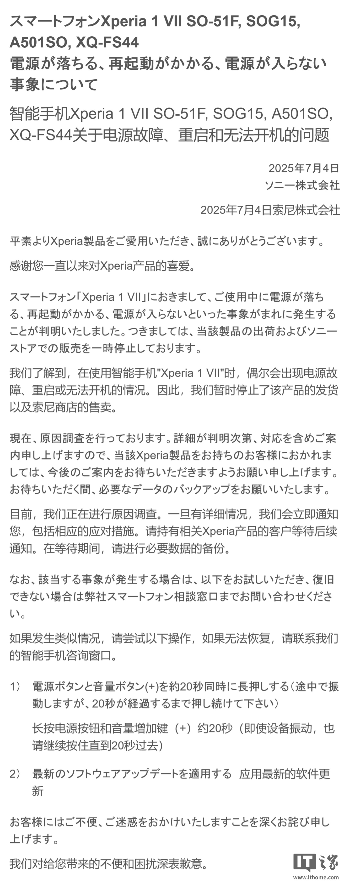 IT之家 7 月 5 日消息,索尼公司昨日(7 月 4 日)在其日本官网发布公告,称收到大量用户反馈报告,Xperia 1 VII 旗舰智能手机存在自动关机、随机重启和无法开机等问题,因此决定在日本境内暂停铺货和销售。