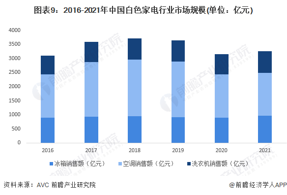 2016-2021年,中国白色家电行业市场规模呈现波动态势。其中,白色家电市场规模在2018年达到顶峰,为3713亿元。2021年中国白色家电市场规模为3264亿元,相比2020年上升了3.32%。