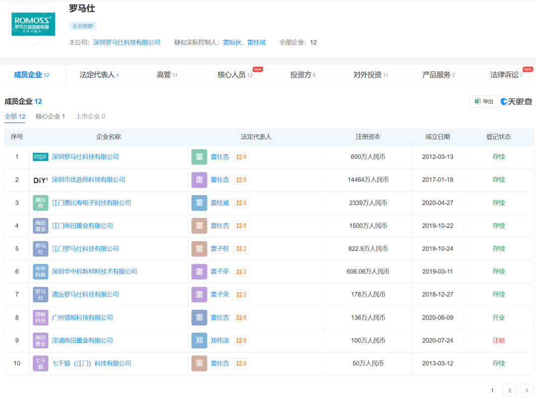 以深圳罗马仕科技有限公司为核心,罗马仕构建了一个有12家公司的企业族群,这些企业中也有相当一部分人为雷姓。