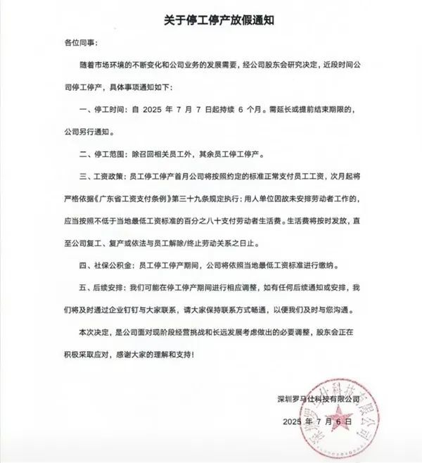 而就在7月6日凌晨,罗马仕发布内部通知,宣布自2025年7月7日起,除负责召回相关工作的员工外,其余员工停工停产,停工时长持续6个月。该通知一出,引发员工及外界诸多猜测,不少员工担忧自身权益保障问题。此前,罗马仕因产品质量问题,召回 2023年6月5日至2024年7月31日期间制造的部分型号充电宝。