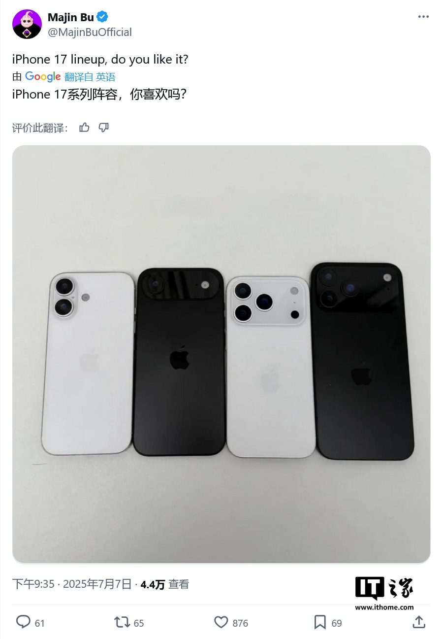 IT之家 7 月 8 日消息,消息源 @MajinBuOfficial 于 7 月 6 日在 X 平台发布推文,分享了一张渲染图,展示了苹果 iPhone 17 Pro 和 iPhone 17 Pro Max 两款旗舰佩戴手机壳后的效果。