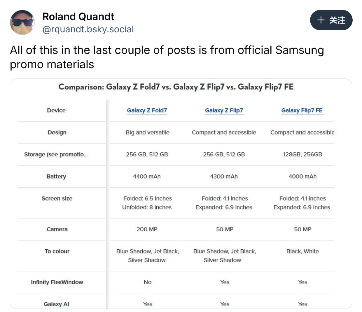 IT之家 7 月 8 日消息,消息源 Roland Quandt 今天(7 月 8 日)在 Bluesky 平台发布动态,分享了三星 Galaxy Z Flip7、Galaxy Z Flip7 FE 三款折叠手机的详细规格和宣传图片,三款新品将于 7 月 9 日发布。