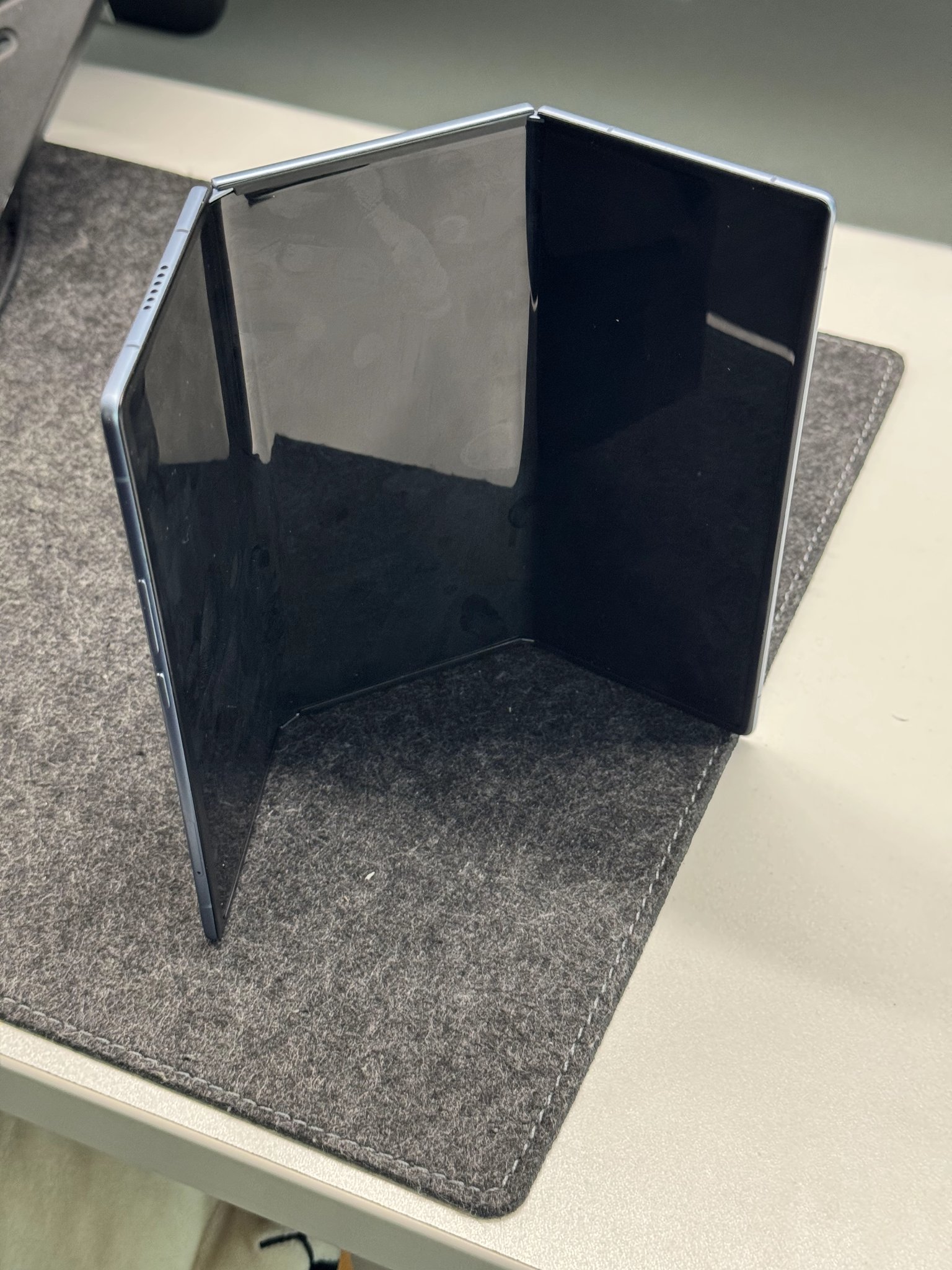 据该博主提供的图片可以看到,该手机有金色、蓝色两种配色,其设计元素、折叠方式与华为 Mate XT 不同,手机背部右侧配有副屏,采用类 C 字形内向折叠设计,折叠时必须先把右侧部分向内折,然后才能将左侧部分折叠(IT之家注:这么做的原因是为了确保外屏在折起时处于顶层)。
