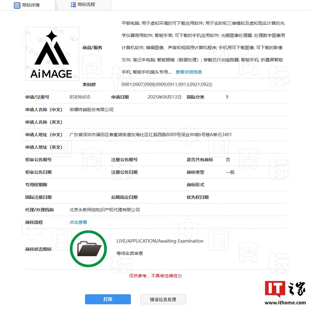 IT之家查询获悉,荣耀终端股份有限公司此次申请的 AiMAGE 图形商标目前处于“等待实质审查”阶段,属国际分类 9,申请 / 注册号为 85896650,涉及的商品 / 服务包括:
