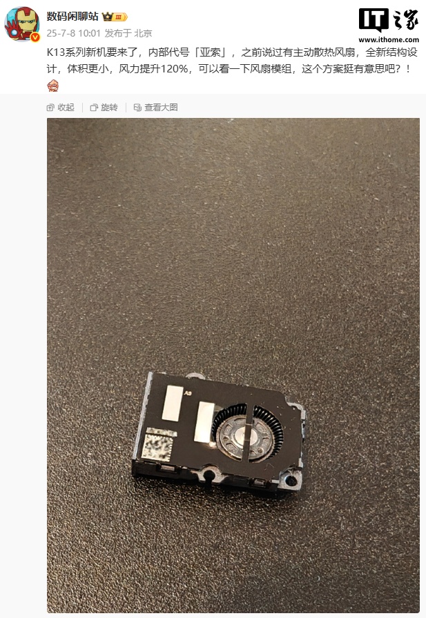 IT之家 7 月 9 日消息,博主 @数码闲聊站 昨日曝光了 K13 系列新机的风扇模组,全新结构设计,体积更小,风力提升 120%。该博主在评论区写道:“听说风扇拉最高档位,玩游戏 1 小时,续航影响大概 2 分钟”