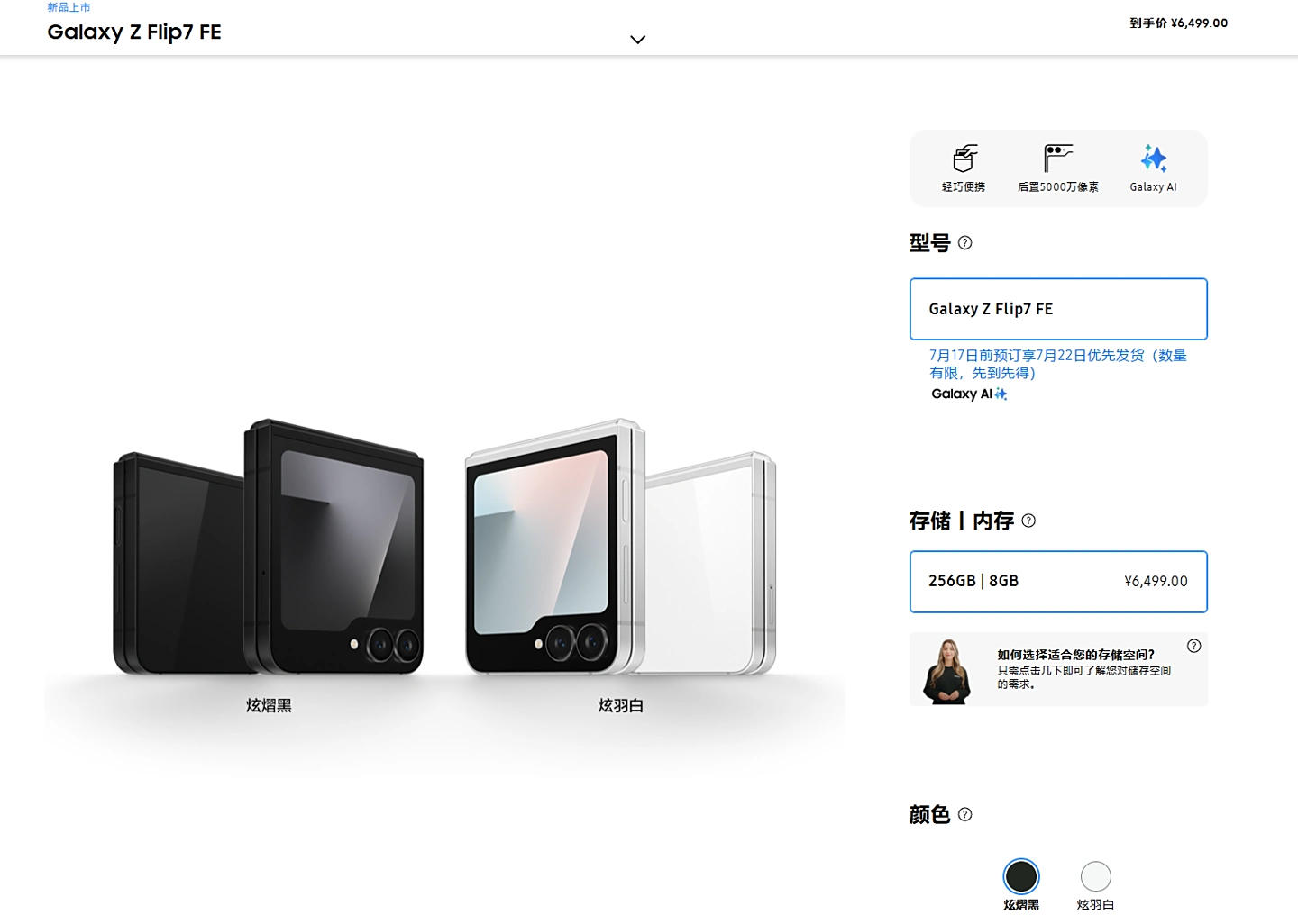 Galaxy Z Flip7 FE 国行提供 8GB 内存 + 256GB 存储一个版本,售价 6499 元,即日起开启预订,7 月 17 日前预订享 7 月 22 日优先发货(数量有限,先到先得)。