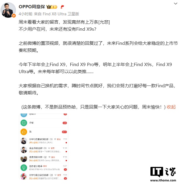 OPPO Find 系列产品负责人周意保 7 月 5 日发文确认,今年下半年发布 Find X9、 Find X9 Pro 等产品,明年上半年发布 Find X9s、Find X9 Ultra 等,未来每年都可以以此类推。