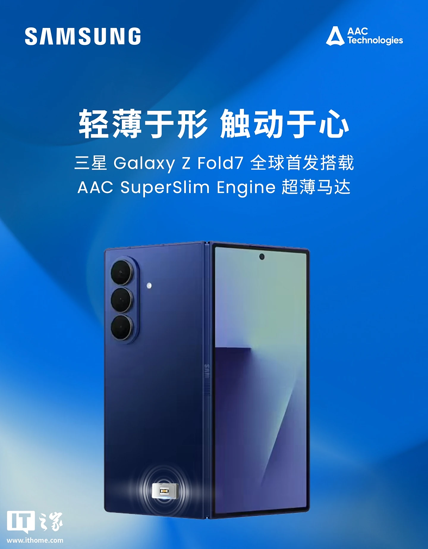 IT之家 7 月 10 日消息,三星昨日召开 Galaxy 全球新品发布会,正式发布超轻薄折叠旗舰 Galaxy Z Fold7 和 Watch8 Classic 等多款新品。据瑞声科技消息,三星 Galaxy Z Fold7 手机全球首发搭载 AAC SuperSlim Engine 超薄马达,号称“刷新手机马达超薄纪录”。