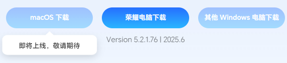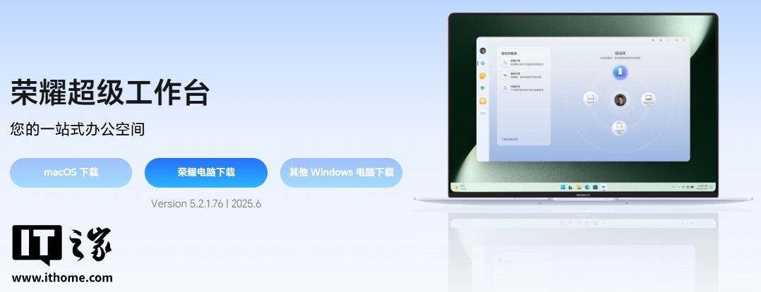 IT之家注意到,荣耀官网显示,荣耀超级工作台目前迭代至 5.2.1.76 版本,当前仅支持“荣耀电脑”平台下载。但相关页面已添加两项暂不可点击的其他平台的下载按钮,包括“macOS 下载”“其他 Windows 电脑下载”。