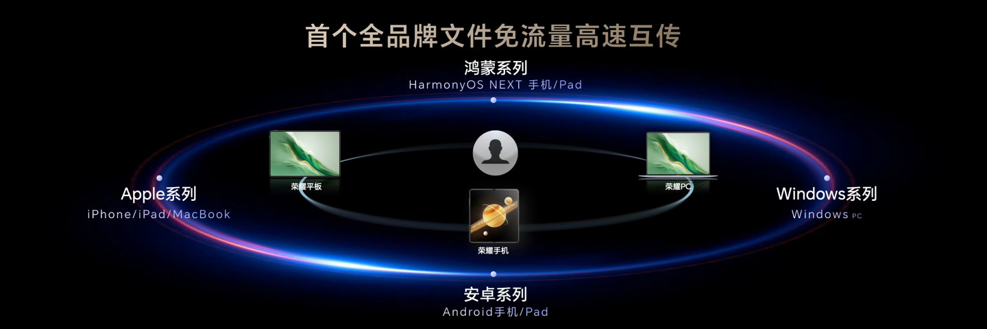 综合IT之家此前报道,荣耀在今年的上海世界移动通信大会上宣布其手机、平板、PC 设备首发支持全品牌设备跨生态互联,可与鸿蒙(HarmonyOS NEXT 手机 / Pad)、Windows(PC)、Apple(iPhone / iPad / MacBook)、安卓(手机 / Pad)系列产品实现免流量高速互传,包括照片、视频、文档等。由此来看,荣耀预计正计划彻底打通 macOS、Windows、安卓、鸿蒙、iOS 生态互联互通。