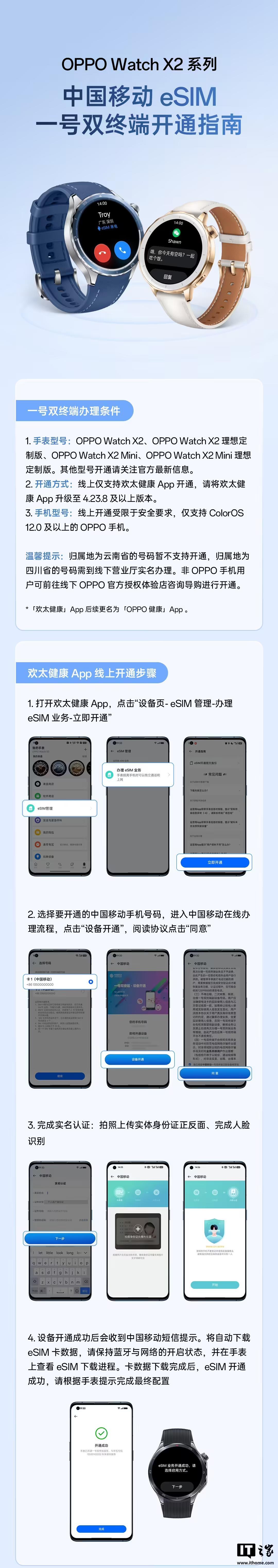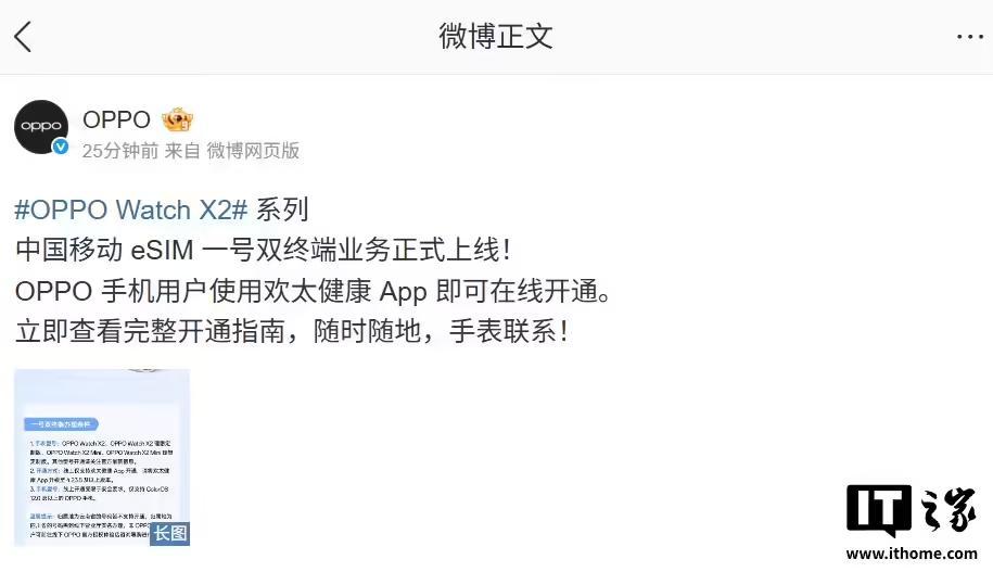 IT之家 7 月 11 日消息,OPPO 今日上线了 OPPO Watch X2 系列手表中国移动 eSIM 一号双终端业务,使用该业务可实现手机与手表共享同一个号码、话费及流量套餐,让双端使用同一号码接打电话。