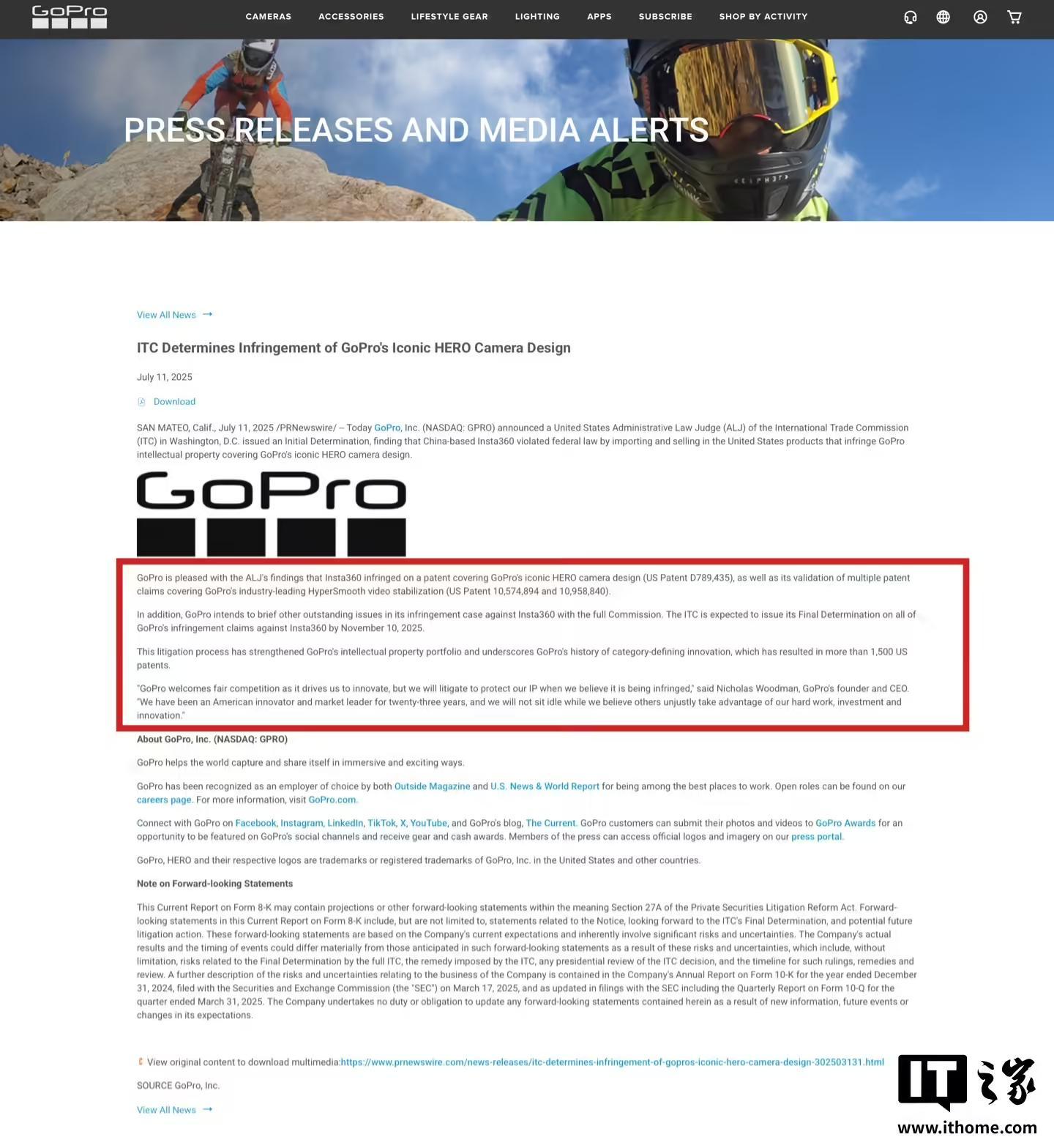 不过,影石 Insta360 则在另一份新闻稿中声称相应侵权无效,称法官已判定 GoPro 所主张的五项与图像稳定、水平校正、图像畸变和宽高比转换相关的实用专利“无效 / 不构成侵权”。