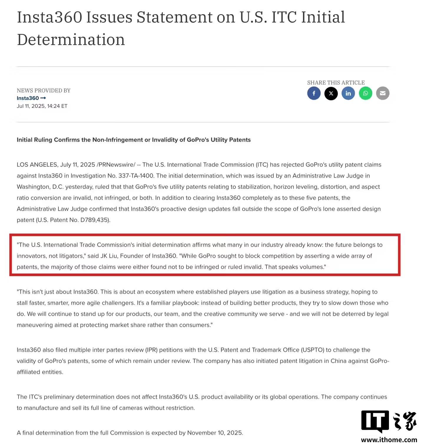 IT之家 7 月 12 日消息,据路透社报道,美国国际贸易委员会(ITC)近日对“影石 Insta360 旗下产品侵犯 GoPro 专利”进行了裁定,提供了“初步判定”结果,相应委员会将于今年 11 月 10 日前作出最终裁定。