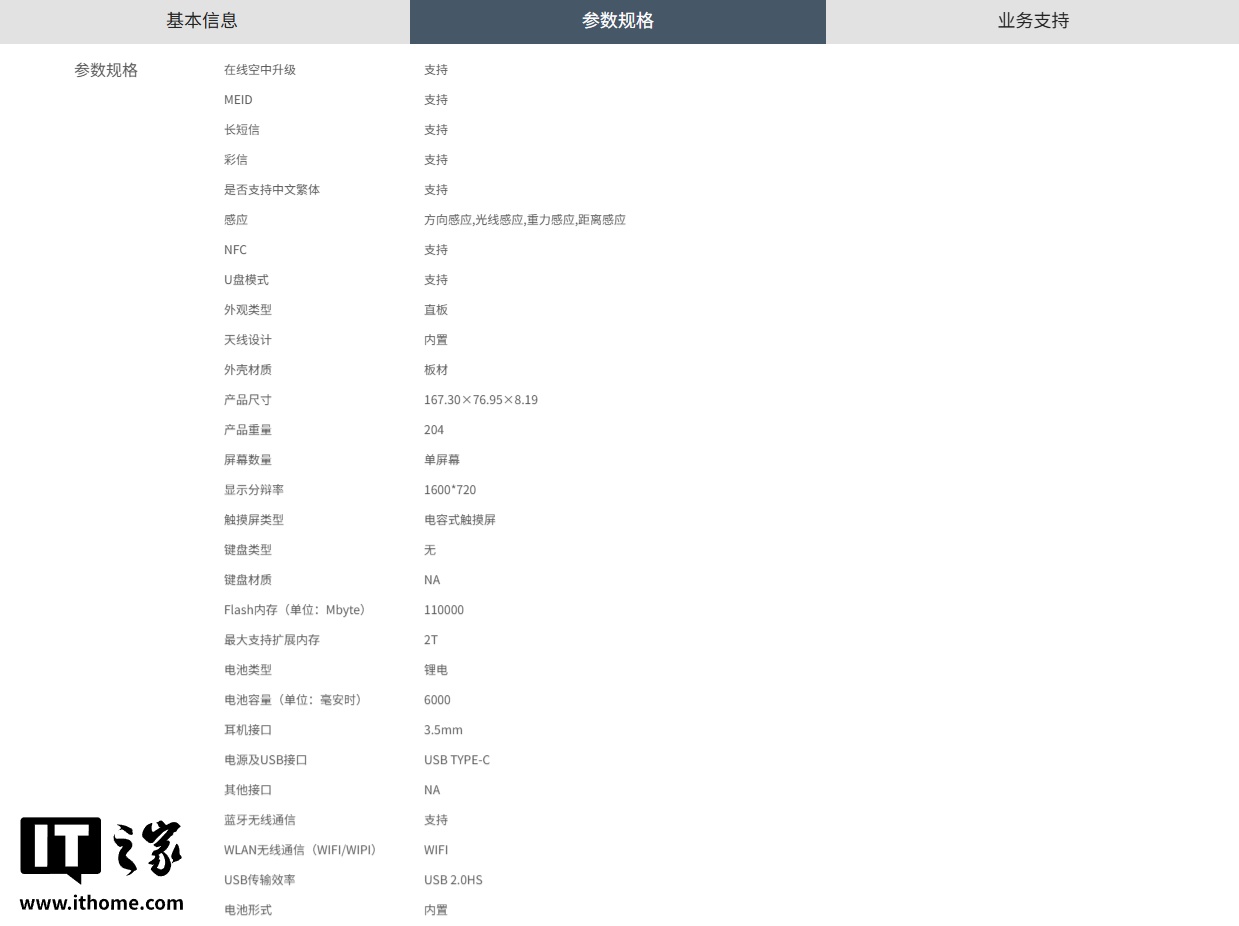 该机尺寸为 167.30×76.95×8.19mm、重约 204g,配备 3.5mm 耳机接口 + USB Type-C 接口(USB 2.0HS 传输速率),其屏幕分辨率为 1600*720,内置 6000mAh 电池。