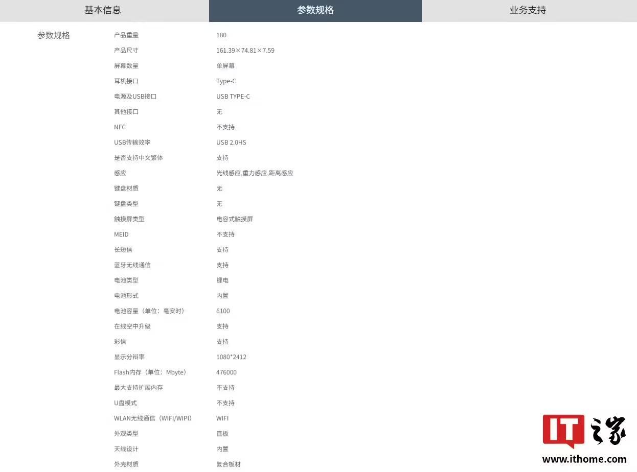 该机尺寸为 161.39×74.81×7.59mm、重约 180g,配备 Type-C 接口(USB 2.0HS 传输速率),其屏幕分辨率为 1080*2412,内置 6100mAh 电池。