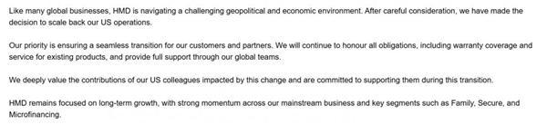 虽然声明中仅用了“缩减营运”这样的保守描述,但媒体普遍认为HMD正在准备退出美国市场。