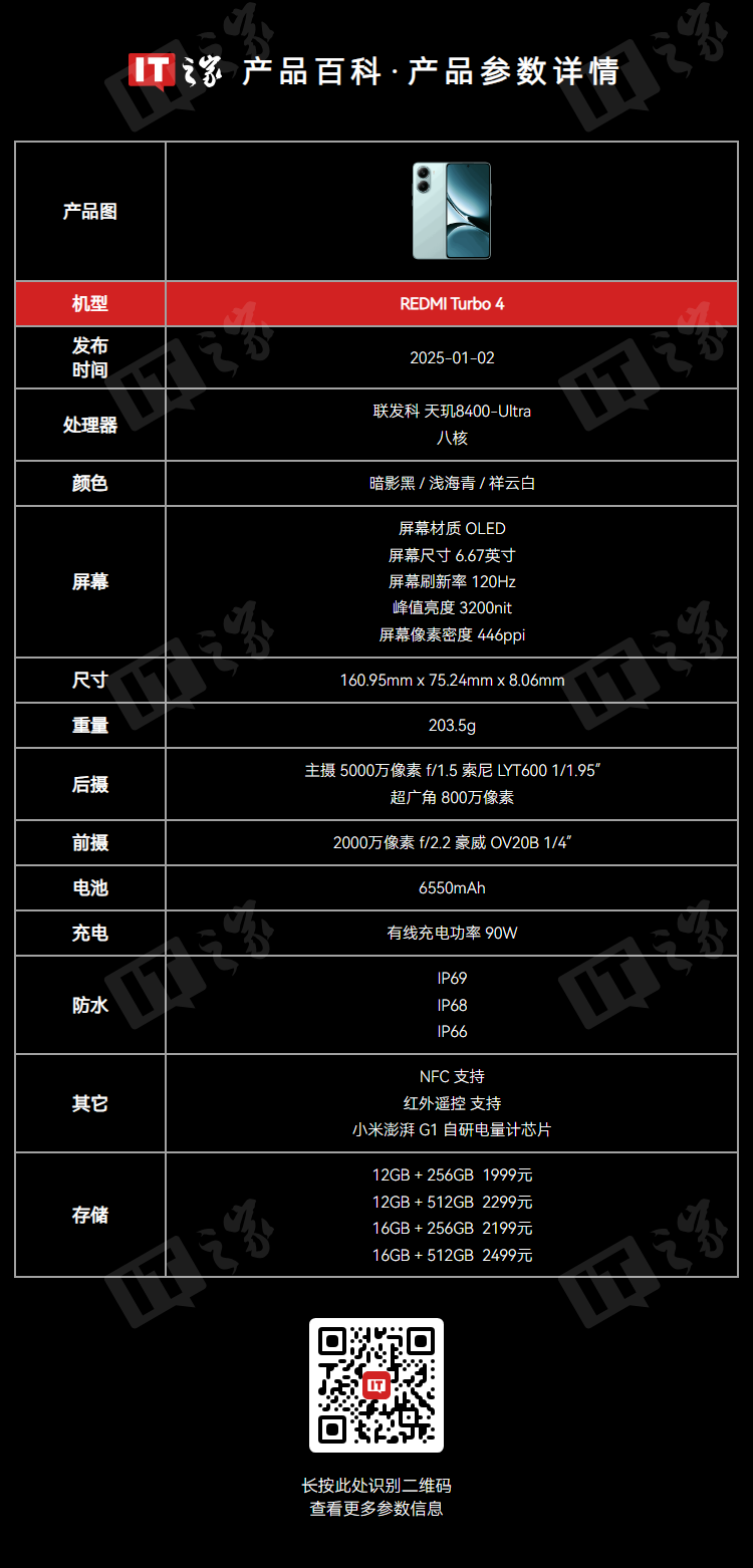 作为比较,现款小米 REDMI Turbo 4 手机于今年 1 月发布,该机采用全新潮流纹理双拼设计,搭配金属相机模组,配备了一块 6.67 英寸 1.5K 分辨率的柔性直屏,首发搭载了天玑 8400-Ultra 移动处理平台,搭载 6550mAh 小米金沙江电池,支持 90W 快充。