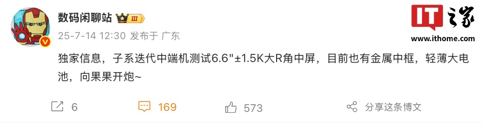 IT之家 7 月 14 日消息,博主 @数码闲聊站 发文,透露某厂商子系迭代中端机测试 6.6″±1.5K 大 R 角中屏,该机同时配备金属中框、轻薄大电池,与苹果产品展开竞争。参考博主暗示和评论区反馈,该机预计为小米 REDMI Turbo 5 手机。
