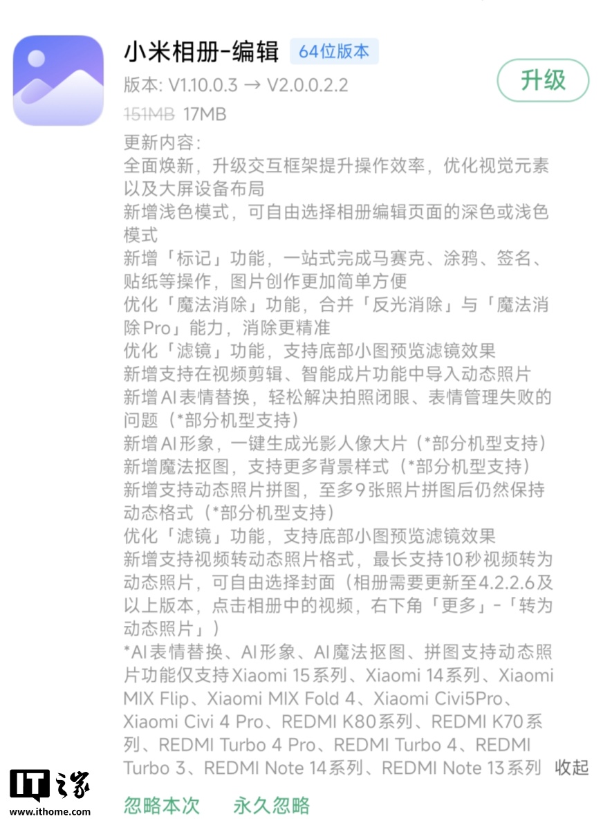 文章来源于互联网:IT之家-小米相册编辑功能更新 2.0.0.2.2 版本:界面大改,新增多项 AI 能力