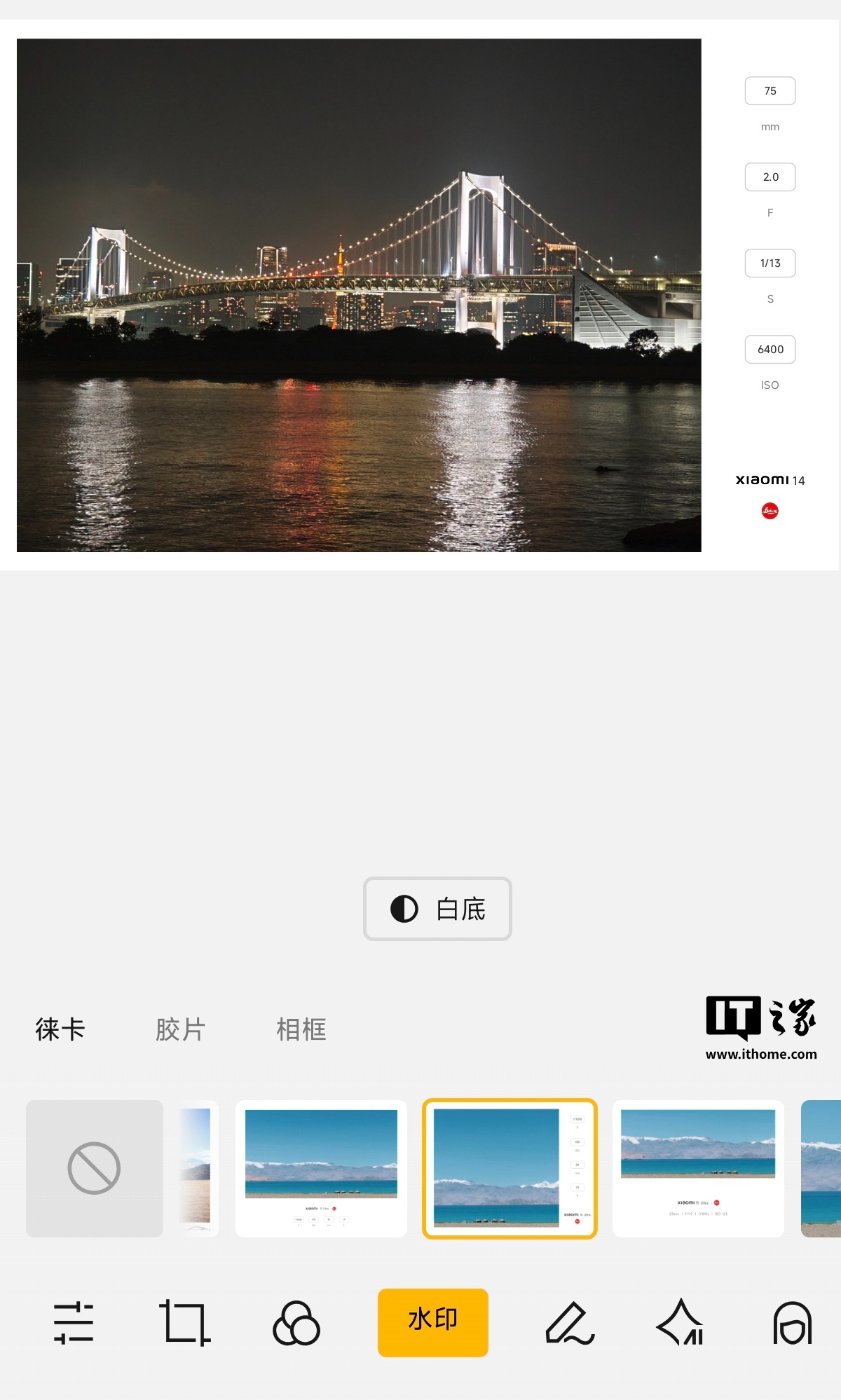 “水印”选项卡也得到了升级,新增了多款水印样式和不同比例相框,方便用户根据不同的摄影风格选择不同的水印相框,提升氛围感。