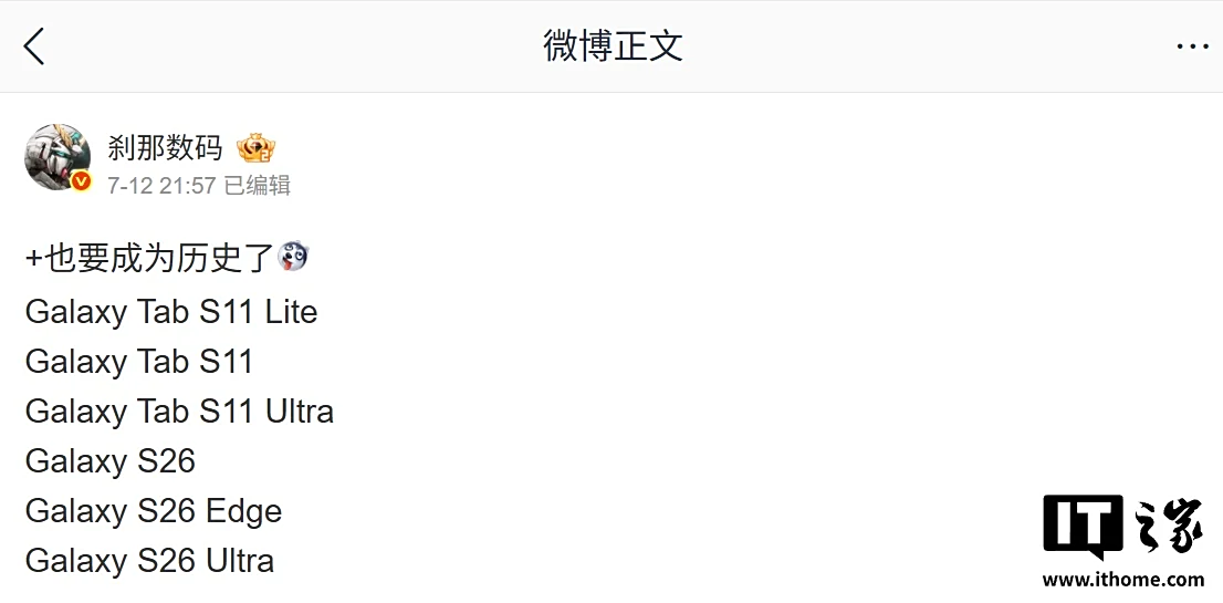 IT之家 7 月 14 日消息,数码博主 @刹那数码 今日于微博发文,称三星 Galaxy S 系列直板手机的 Plus(+)、FE 版本机型将停更,成为历史。