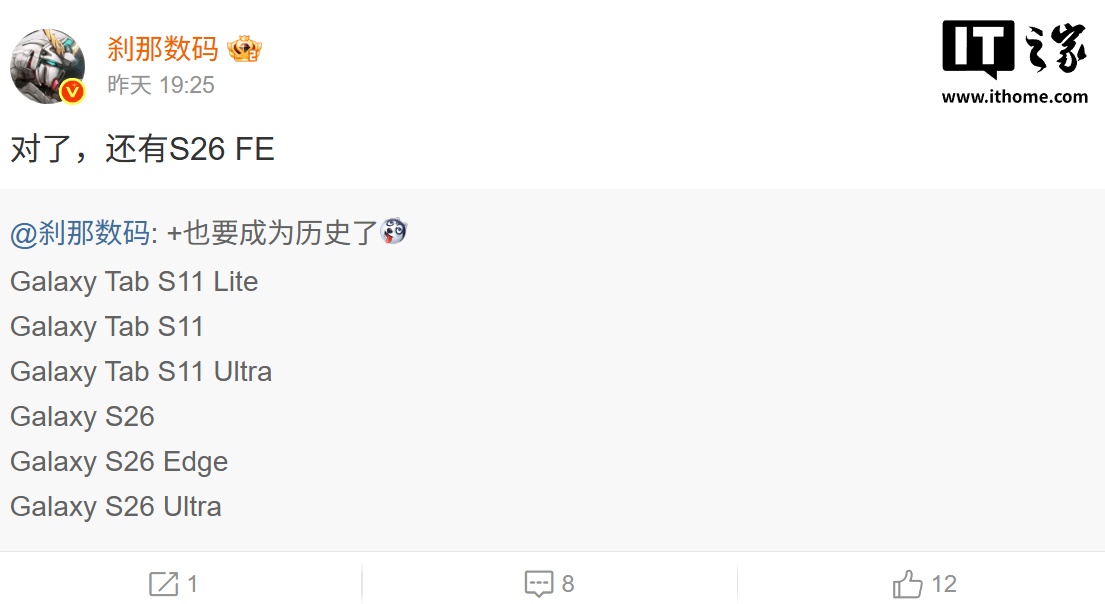 后续,该博主转发了此微博,并补充道:“对了,还有 S26 FE”。