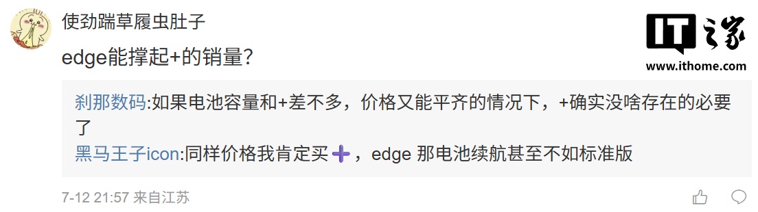 有网友于评论区向该博主询问:“edge 能撑起 + 的销量?”,而该博主则表示:“如果电池容量和 + 差不多,价格又能齐平的情况下,+ 确实没啥存在的必要了”。
